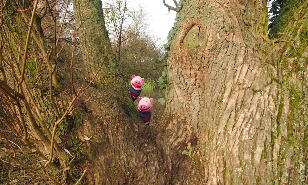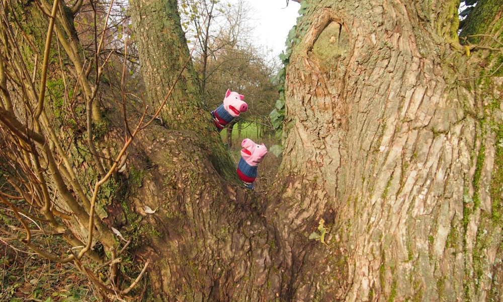 Zur Übung klettern die Schweine zunächst auf einen Baum.