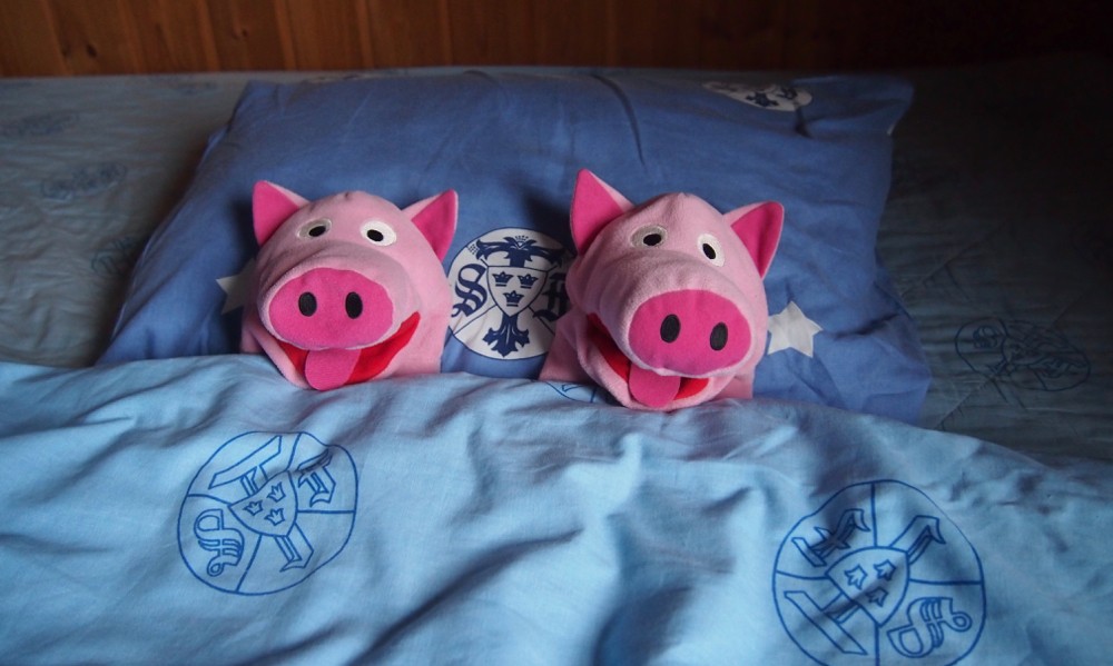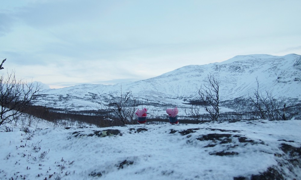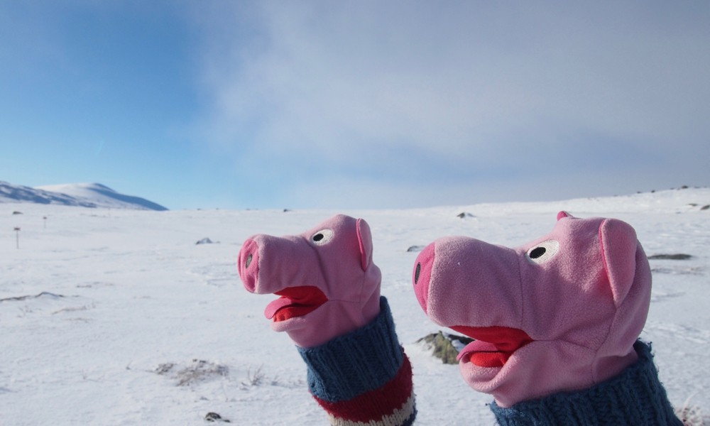 Die Schweine wollten mal einen richtigen Winter sehen und haben sich auf den Weg in die schwedischen Berge gemacht. Da gab es reichliche und herrliche Landschaft, allerdings fiel ein eklatanter Mangel an Kartoffeln auf.