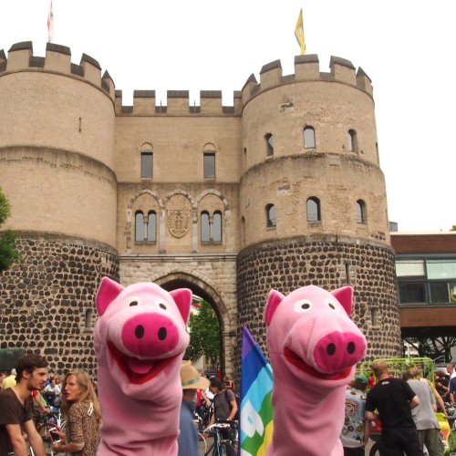 Die Schweine treffen sich mit anderen Radfahrern zur Critical Mass am Rudolfplatz