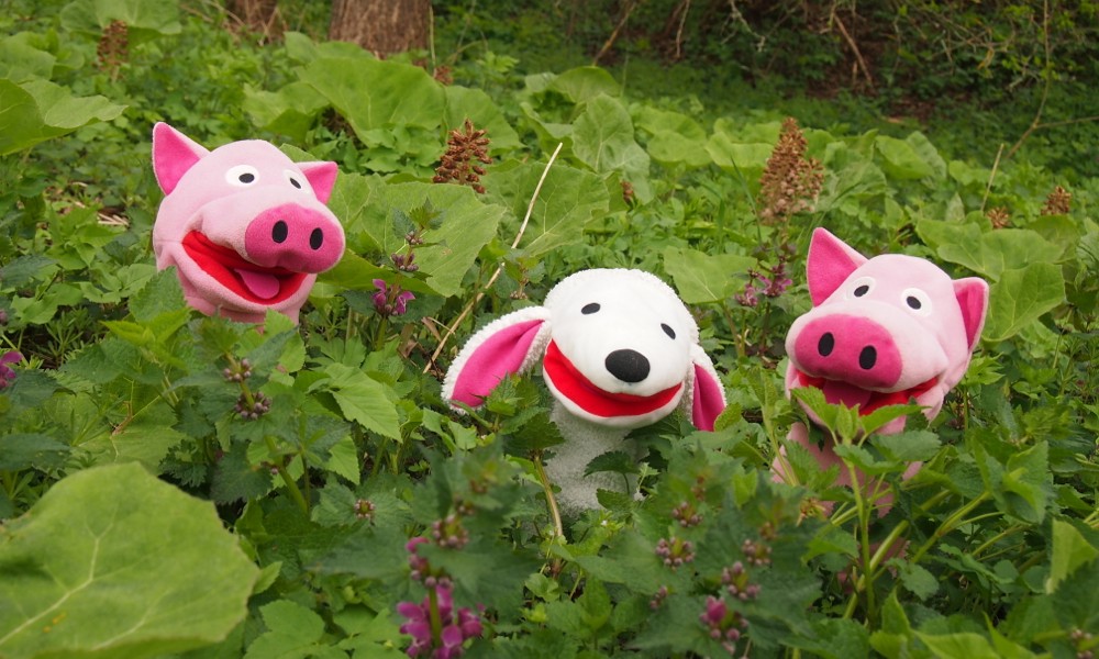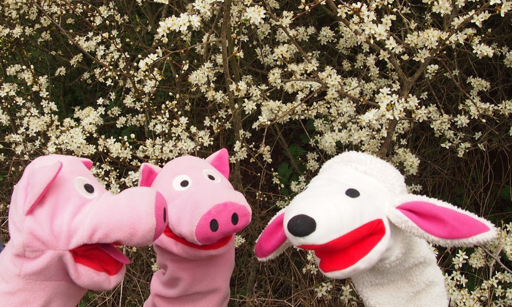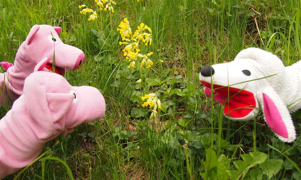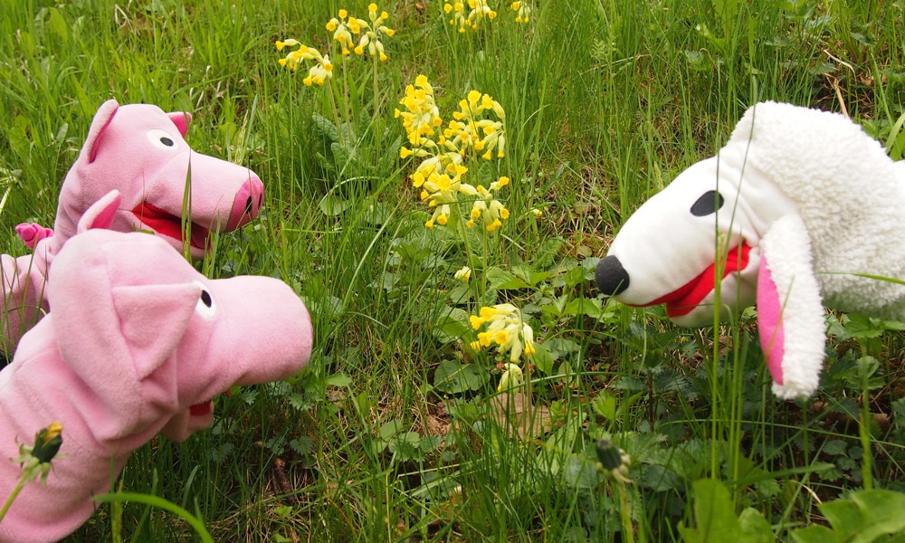 Zusammen bewundern Schweine und Schaf die Schlüsselblumen.