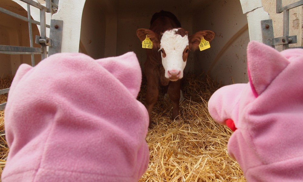 Die Schweine sind dem Kalb wohl nicht geheuer.