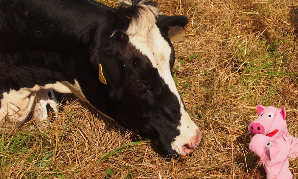 Bei Karin,der Kuh, fragen die Schweine höflich nach etwas frischer Milch.