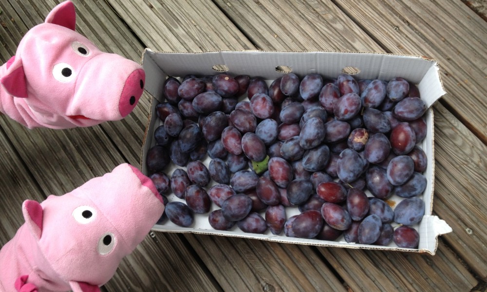 Auf einer Tombola haben die Schweine eine Kiste Pflaumen gewonnen. Super! Und viel Arbeit, denn die Schweine haben sich entschlossen, Pflaumenmus zu kochen.