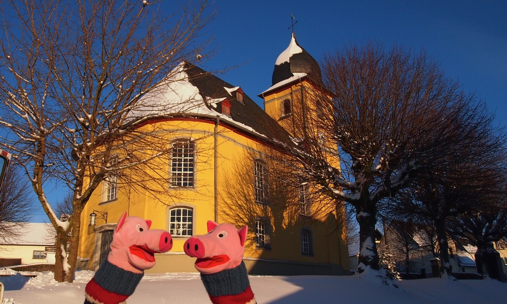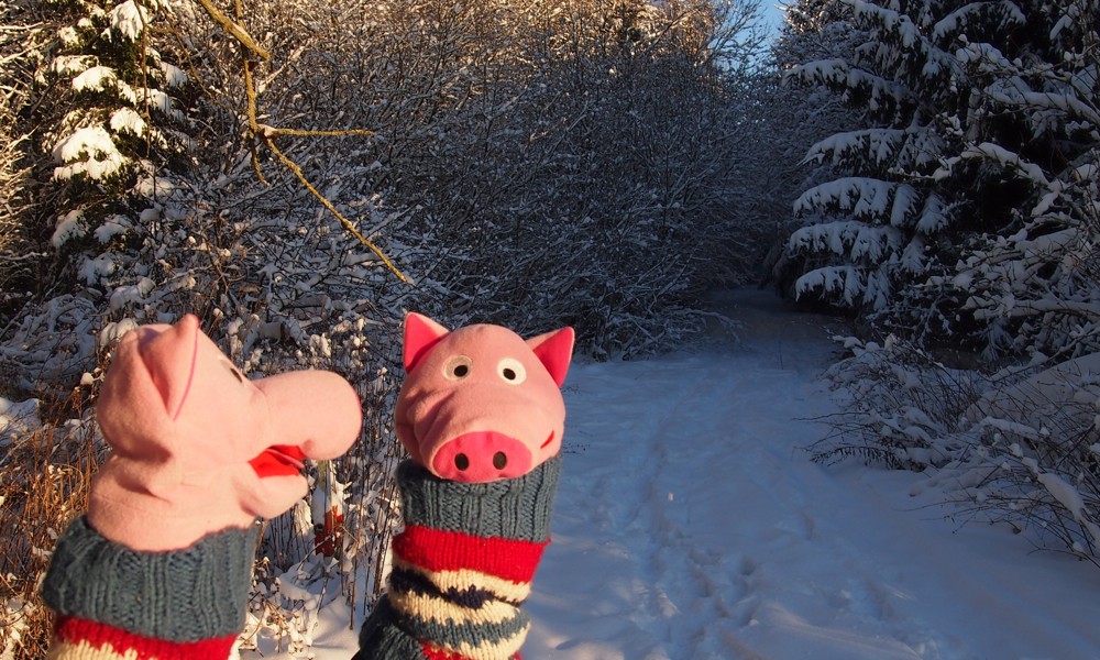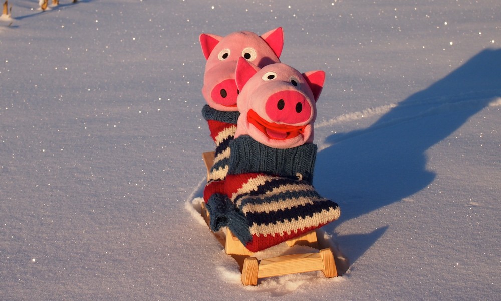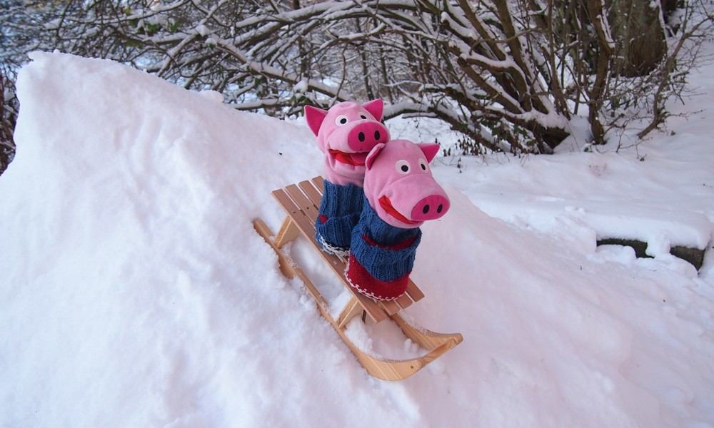 Fast hätten die Schweine vergessen dass sie ja Schlitten fahren wollten - huiii, das ist aber steil!