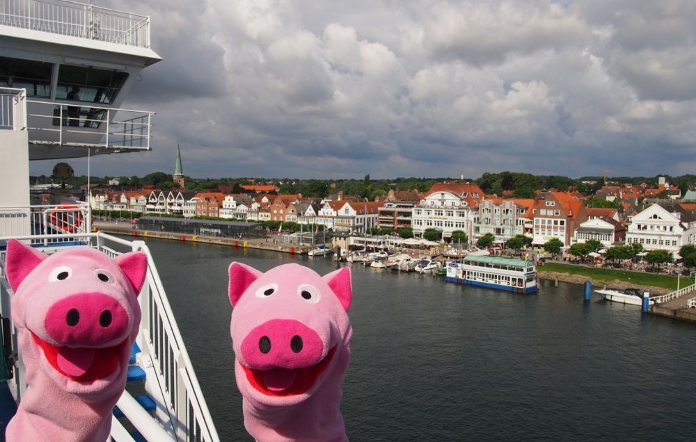 Schweine auf großer Fahrt. Nachts geht es auf die Fähre.