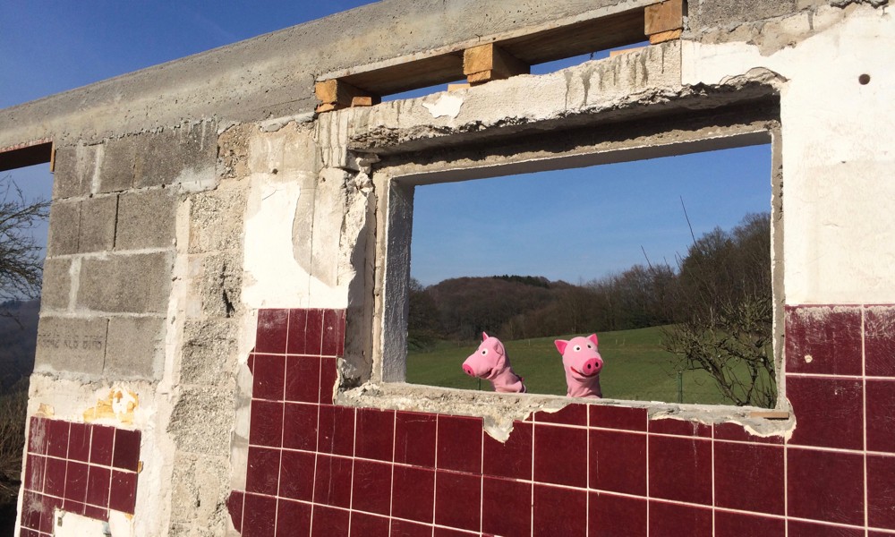 Die Schweine haben sich ja diesen alten Stall im Bergischen gekauft, den sie jetzt von Grund auf renovieren lassen. Anlass genug für eine Bauaufsichtsreise. Nebst einer Kartoffelküche und einem Gästezimmer wird es im Garten auch eine große Suhle geben.