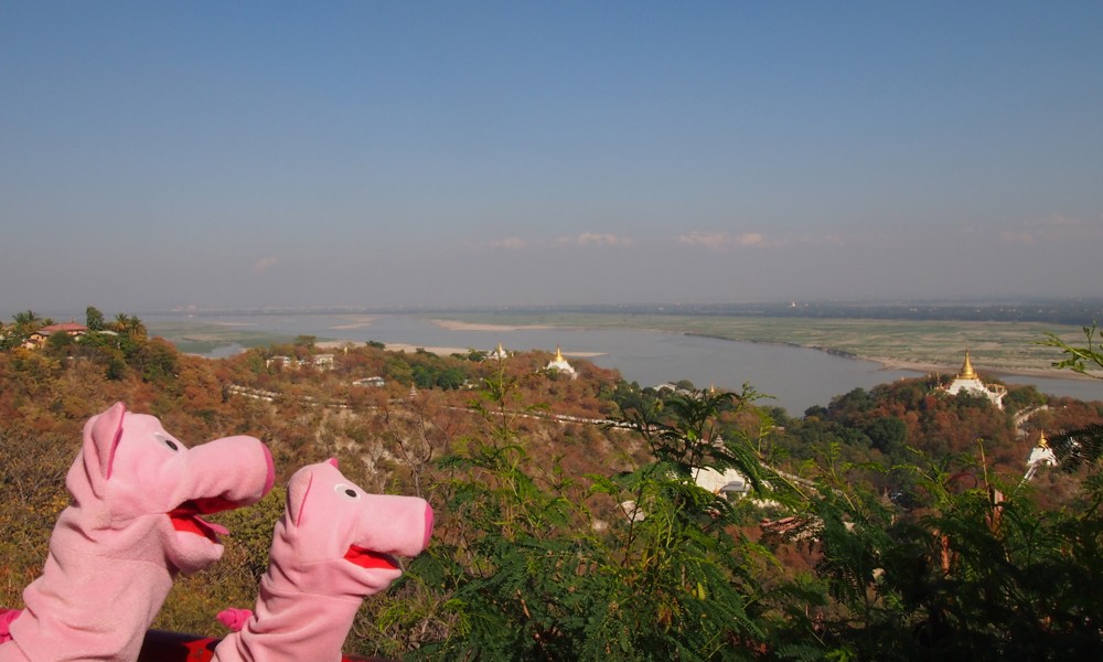 Die Schweine befahren den Irawaddy mit einem reparaturbedürftigen Motorboot.