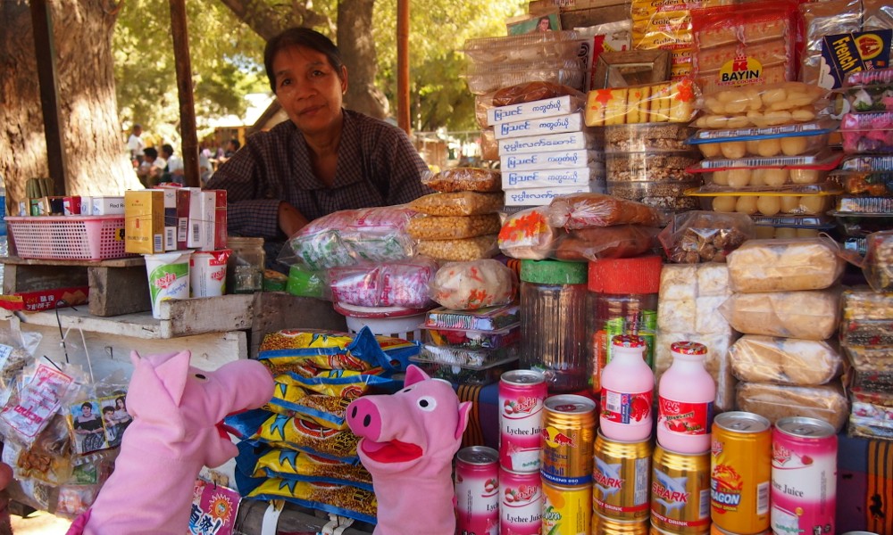 Unterwegs kaufen sie an einem Kiosk Kekse. Die Frau hat vorher noch nie was an Schweine verkauft.