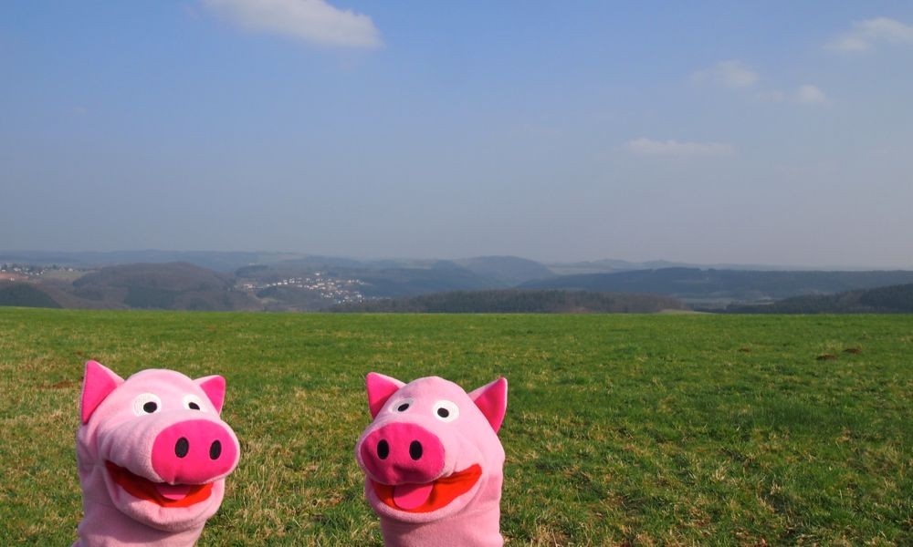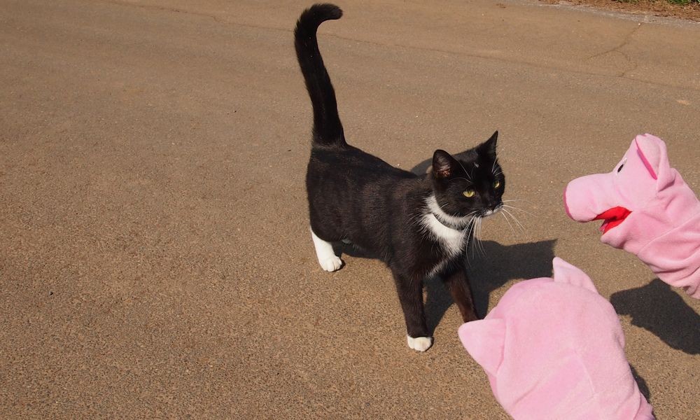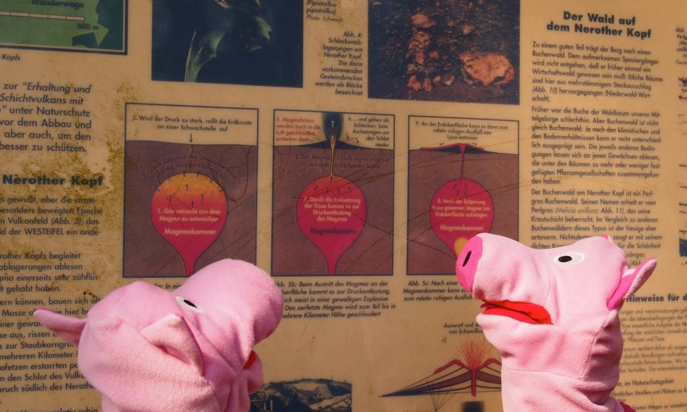 Die Schweine erzählen der Katze, dass sie gerade von einem Vulkan abgestiegen sind.