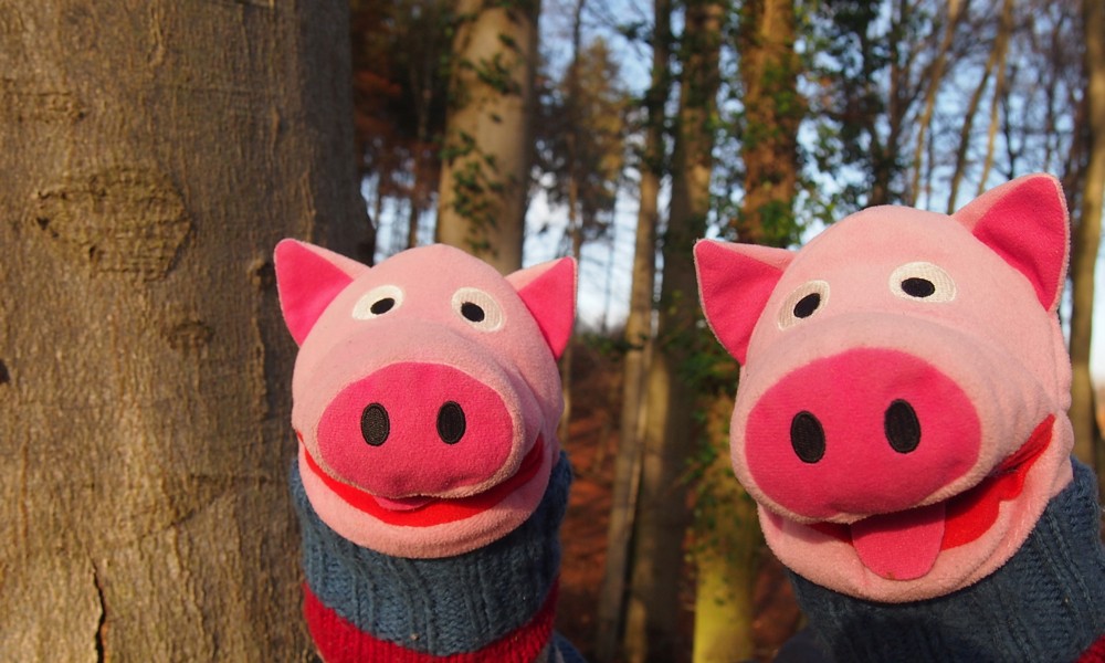 Im Wald treffen die Schweine eine Nacktschnecke. Muss ja ganz schön kalt sein ohne Pulli.