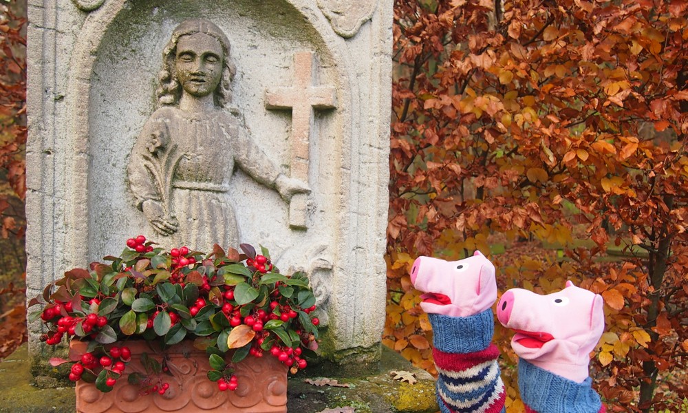 Auf dem Weg nach unten kommen die Schweine am Margarethenkreuz vorbei und singen ein Adventslied.