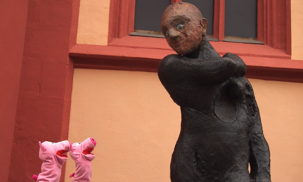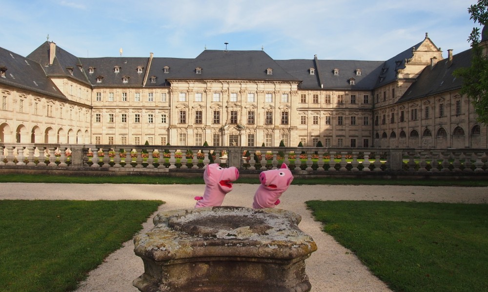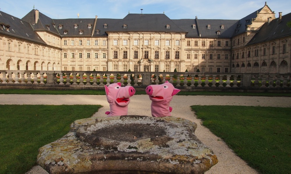 Ein Schwein erklärt, dass in dem Kloster in Eberach jetzt ein Knast untergebracht ist.