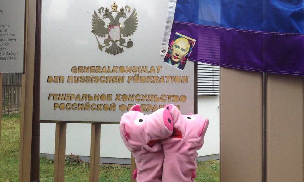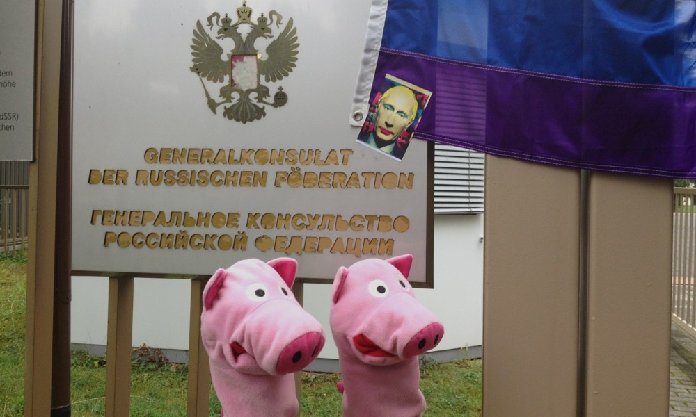 Die Schweine haben an Ihrer ersten politischen Demonstration teilgenommen. Sie finden es nämlich blöd, dass zwei Eber sich in Russland nicht lieb haben sollen. Daher haben sie es dem fiesen Putin mal richtig gezeigt. Erfreulich war allerdings, dass der Weg zum russischen Generalkonsulat durch Schweinheim führte.