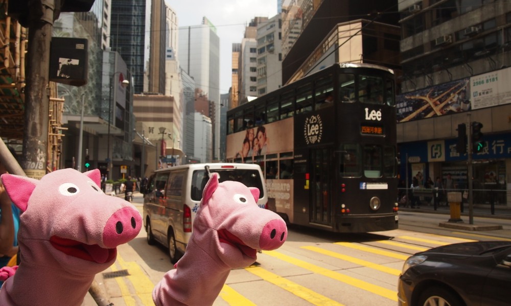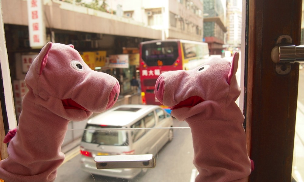 Toll! Doppelstöckige Straßenbahnen! Die Schweine fahren nach Happy Valley.