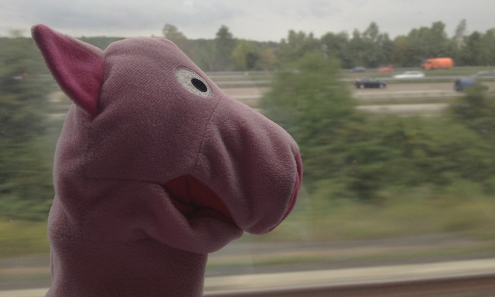 Schwein unterwegs mit dem Zug: hier durch Frankfurt ...