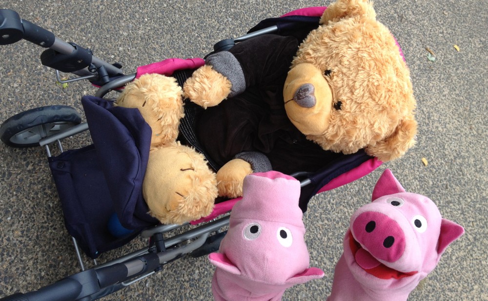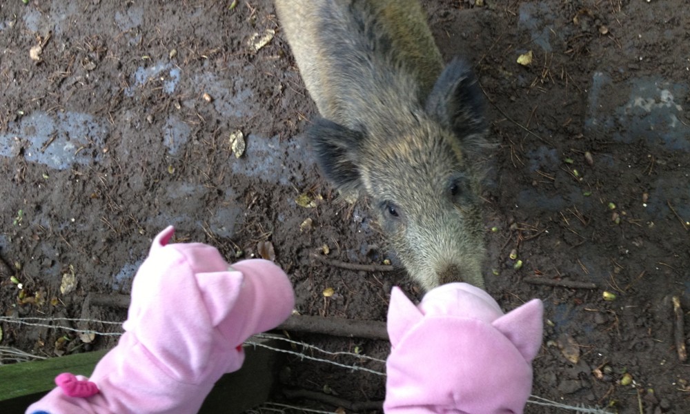 Zusammen gehen die Schweine Spazieren und treffen ein Bärenkind.