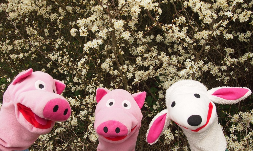 Zusammen bewundern Schweine und Schaf die Schlüsselblumen.