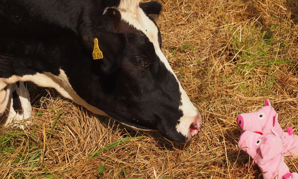 Bei Karin,der Kuh, fragen die Schweine höflich nach etwas frischer Milch.