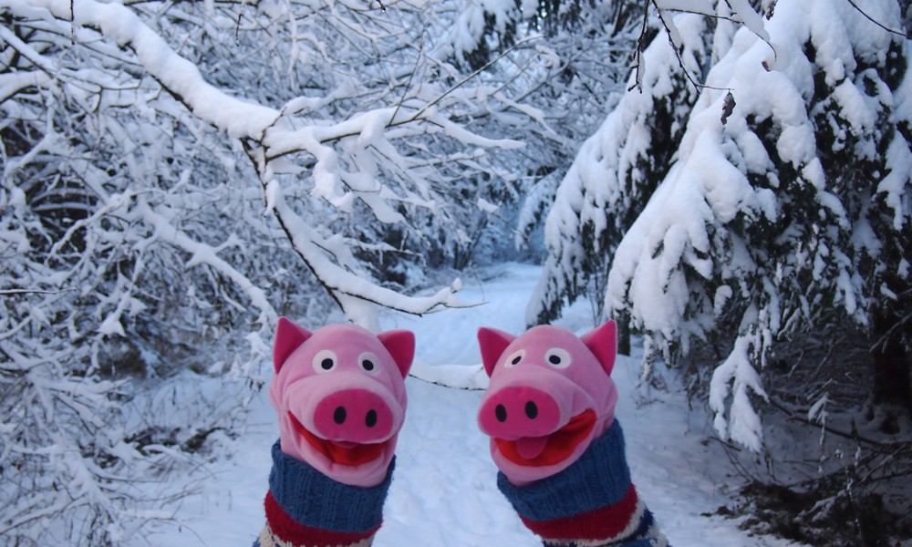 Fast hätten die Schweine vergessen dass sie ja Schlitten fahren wollten - huiii, das ist aber steil!