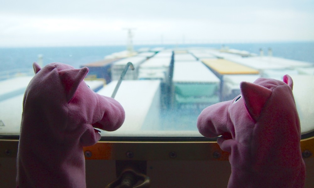 Die Schweine fahren mit einem LKW-Parkplatz übers Meer.