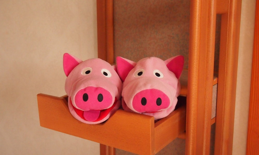 Unterwegs haben die Schweine in einer Schublade übernachtet (schlanke Schweine)