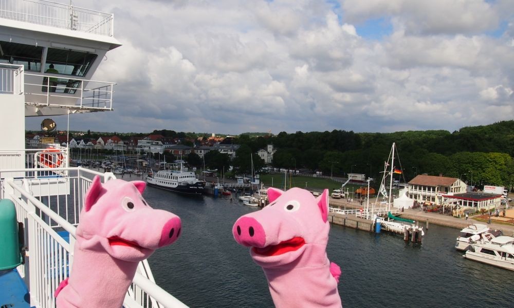 Schweine auf großer Fahrt. Nachts geht es auf die Fähre.