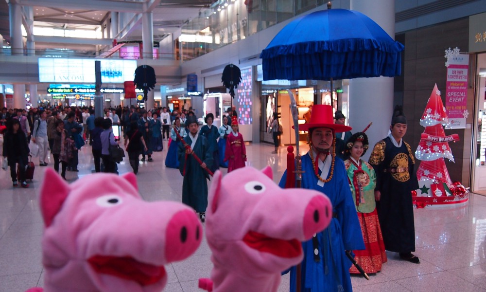 Zwischenlandung in Korea. Die Schweine werden misstrauisch von Eingeborenen beäugt.