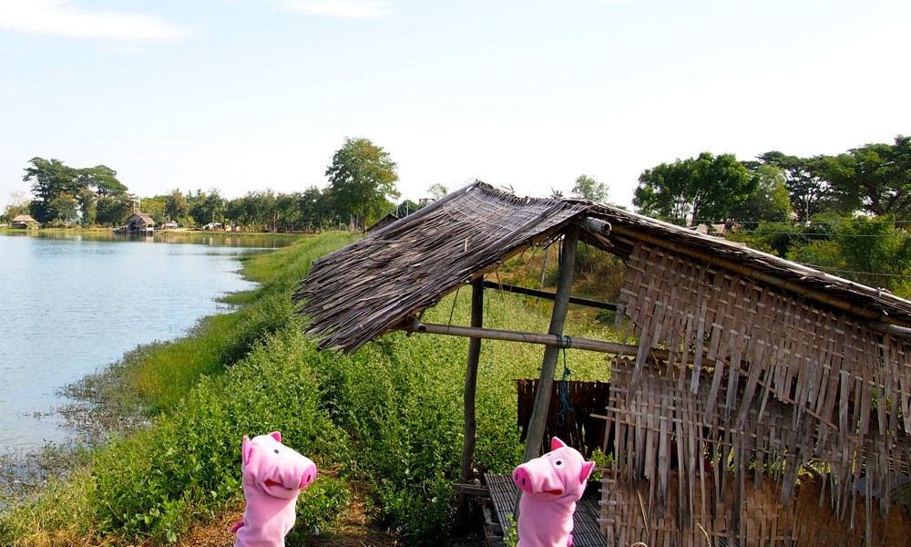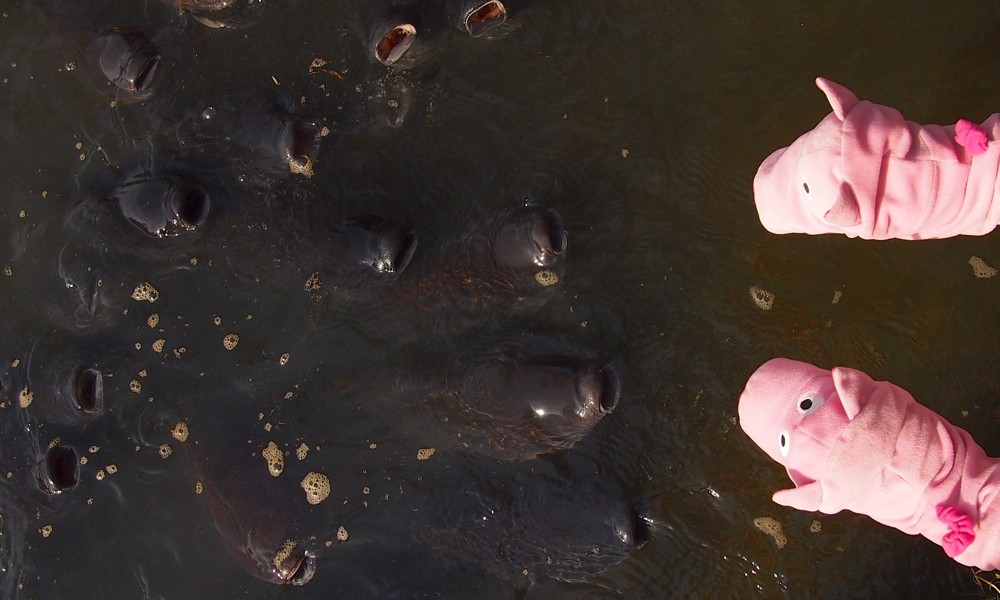 Die Karpfen möchten mit den Schweinen Baden. Die sind skeptisch.