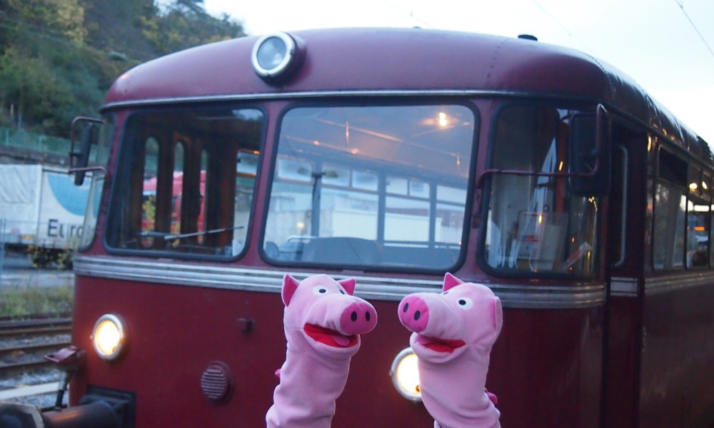 Nach Hause fahren die Schweine mit dem Schienenbus.